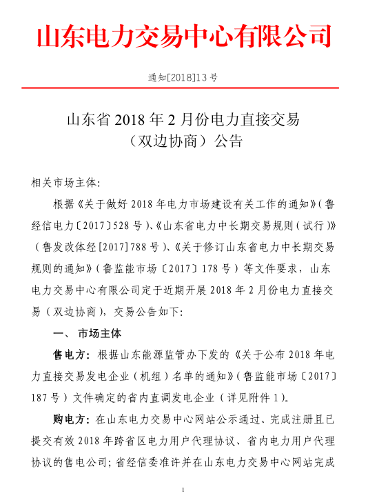 山東電力交易中心日前發(fā)布了《山東省2018年2月份電力直接交易(雙邊協(xié)商)公告》,公告中稱(chēng),本次交易采取雙邊協(xié)商交易方式,協(xié)商的直接交