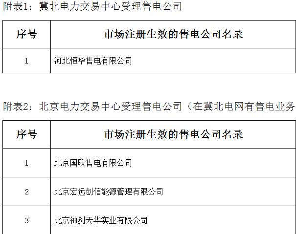 公示期間,冀北電力交易中心有限公司未收到市場有關方面提出異議。按照國家發(fā)改委、國家能源局《售電公司準入與退出管理辦法》和河北省發(fā)改委《河北省售電公司準入與退出管理細則》有關規(guī)定,以下附表所列27家售電公司在冀北電力交易中心的注冊手續(xù)自動生效。原文如下: