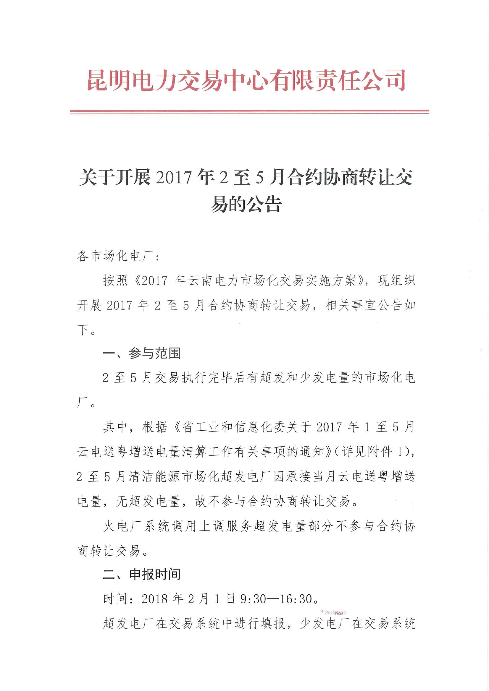 昆明電力交易中心按照《2017年云南電力市場(chǎng)化交易實(shí)施方案》組織開展2017年2至5月合約協(xié)商轉(zhuǎn)讓交易工作:其中,2至5月清潔能源市場(chǎng)化超發(fā)電