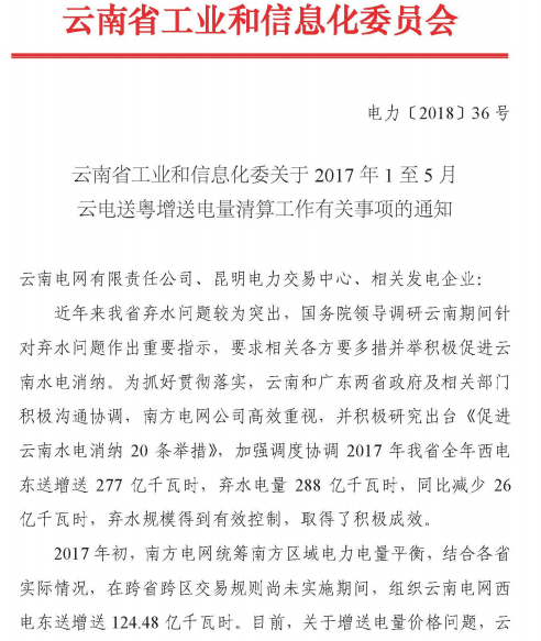 云南省工業(yè)和信息化委員會日前發(fā)布《關(guān)于2017年1至5月云電送粵增送電量清算工作有關(guān)事項的通知》指出: