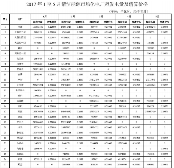 《2017年1至5月清潔能源市場化電廠超發(fā)電量及清算價格》