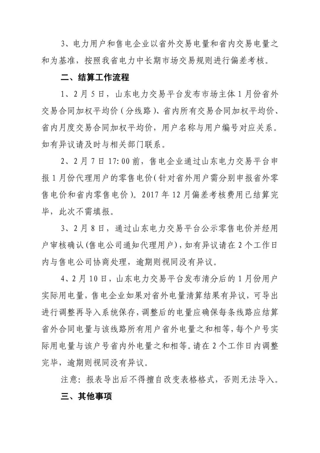 02 2月7日17時(shí)前,售電企業(yè)通過(guò)山東電力交易平臺(tái)申報(bào)1月份代理用戶的零售電價(jià)(針對(duì)省外用戶需分別申報(bào)省外零售電價(jià)和省內(nèi)零售電價(jià))。2017年12月偏差考核費(fèi)用已結(jié)算完畢,此次不需填報(bào)。