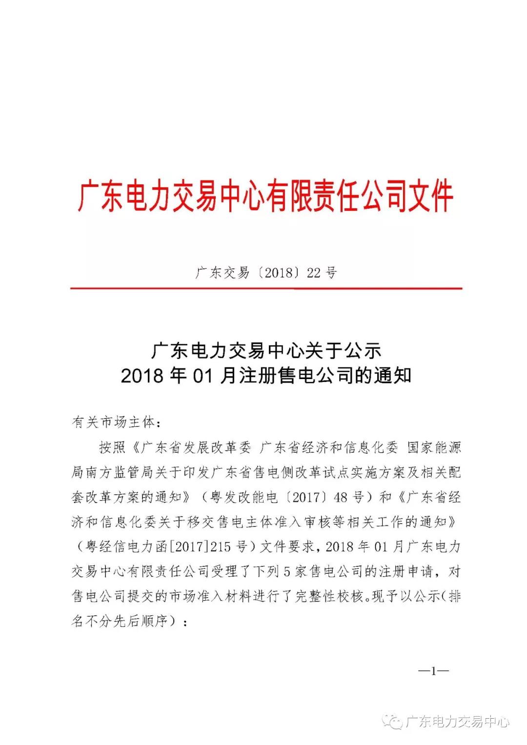 廣東2018年1月新公示5家售電公司 另有2家售電公司注冊(cè)信息變更
