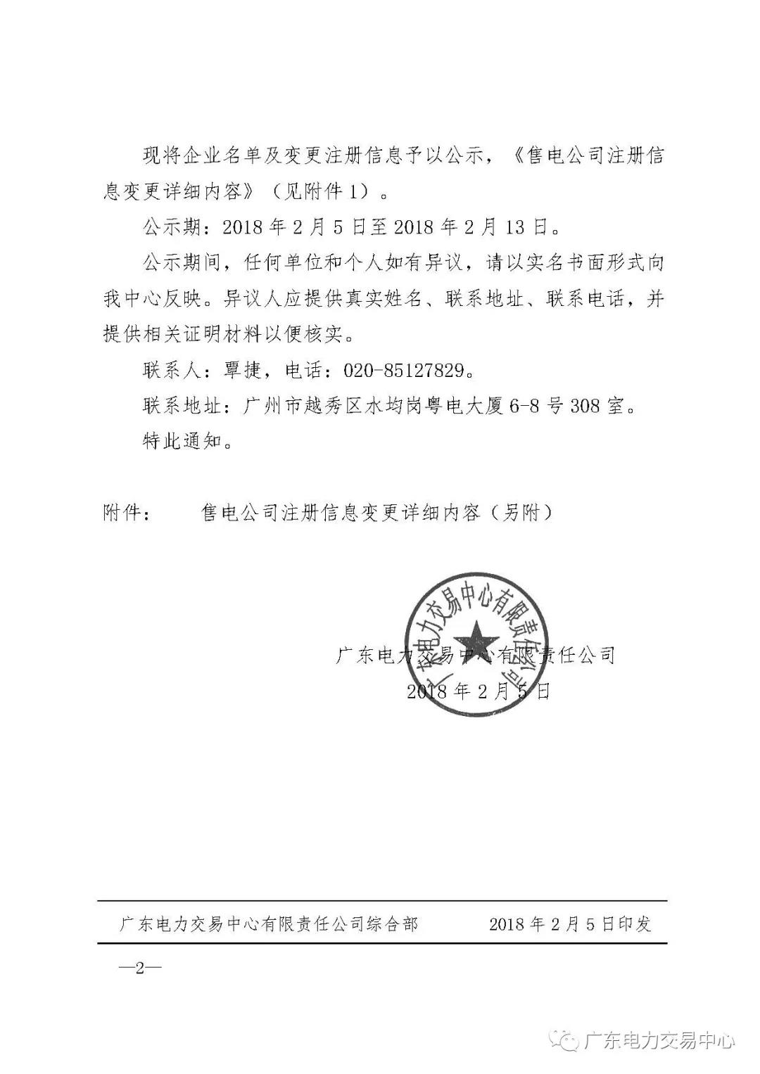 另外,廣東電力交易中心還公布了九州售電有限公司等兩家售電公司注冊(cè)信息變更的公示通知,公示期為2018年2月5日至2018年2月13日。詳情如下: