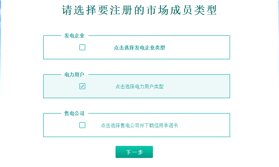 03.用電企業(yè)注冊,選擇“點擊選擇電力用戶類型”,點擊“下一步”填寫賬號信息。