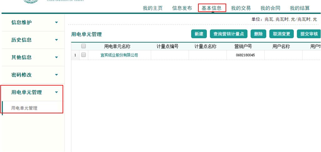 10.用戶若需變更用電單元信息,在“基本信息-用電單元管理”中進行新建、刪除和修改操作,并提交審核。