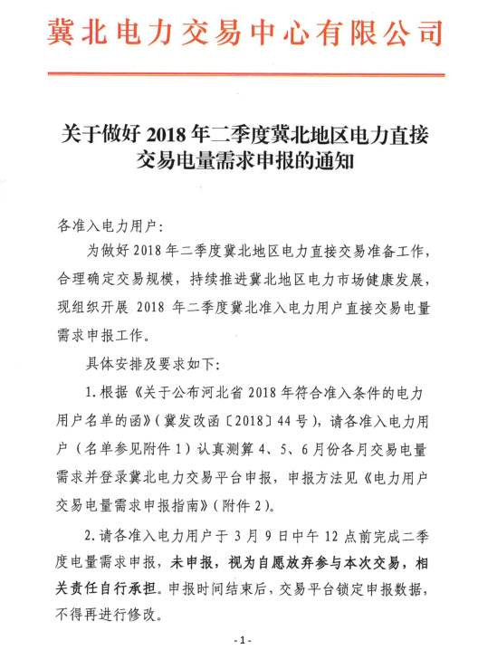 二季度冀北地區(qū)電力直接交易電量需求開(kāi)始申報(bào)(附電力用戶(hù)名單)
