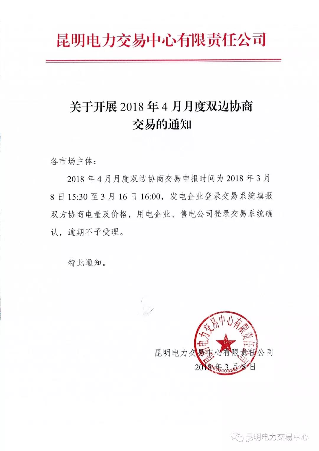 昆明電力交易中心日前發(fā)布了《關(guān)于開展2018年4月月度雙邊協(xié)商交易的通知》,通知中稱,4月月度雙邊協(xié)商交易申報(bào)時(shí)間為3月8日15:30至3月16