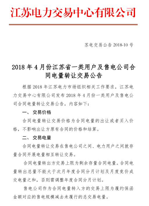 江蘇電力交易中心日前發(fā)布了《2018年4月江蘇省一類用戶及售電公司合同電量轉(zhuǎn)讓交易公告》,公告中稱,合同電量轉(zhuǎn)讓交易在售電公司之間、電