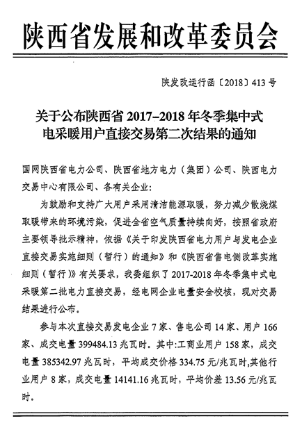 附件1:關(guān)于公布陜西省2017-2018年冬季集中式電采暖用戶直接交易結(jié)果的通知(陜發(fā)改運(yùn)行函[2018]413號)