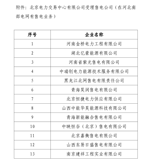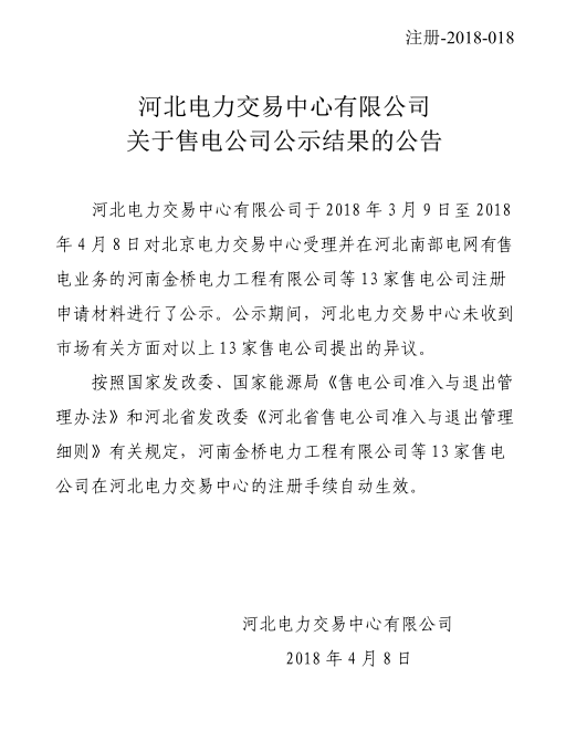 另外,河南金橋電力工程有限公司等13家售電公司在河北電力交易中心的注冊手續(xù)自動生效。