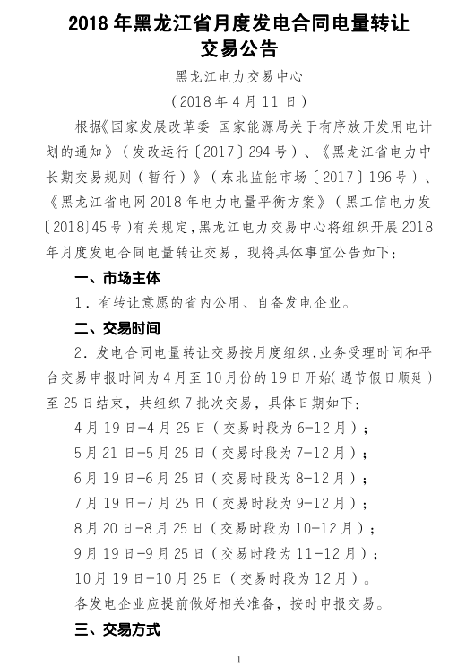 2018年黑龍江省月度發(fā)電合同電量轉(zhuǎn)讓交易即將展開