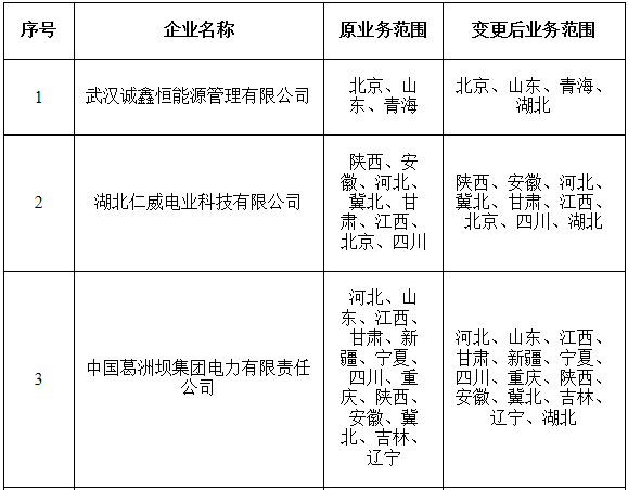 按照國家發(fā)改委、國家能源局《售電公司準(zhǔn)入與退出管理辦法》的要求,北京電力交易中心受理了下列售電公司的業(yè)務(wù)范圍變更申請(qǐng),對(duì)售電公司提交的變更申請(qǐng)材料進(jìn)行了完整性核驗(yàn),現(xiàn)將企業(yè)名單及有關(guān)情況予以公示。