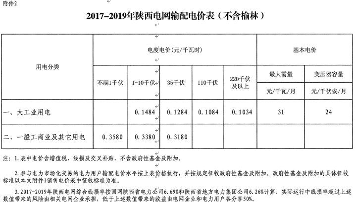 2.2017-2019年陜西電網(wǎng)輸配電價表(不含榆林)