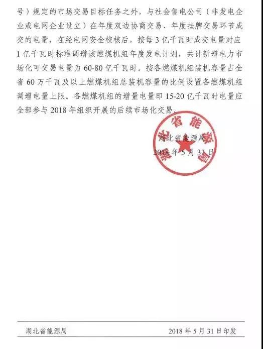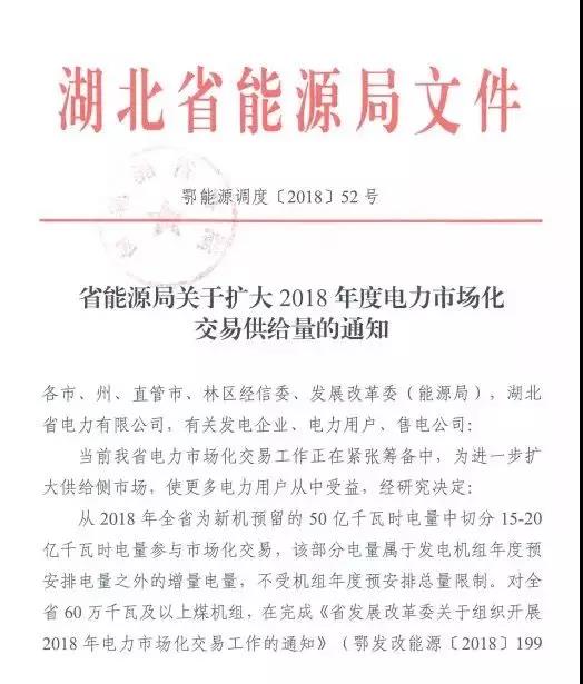 利好|《湖北省能源局關(guān)于擴大2018年度電力市場化交易供給量的通知》