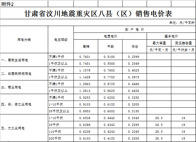 對省內(nèi)一般工商業(yè)用電(除汶川地震重災八縣區(qū)非居民照明、非普工業(yè)用電)價格,在現(xiàn)行標準基礎上每千瓦時統(tǒng)一降低1.74分錢;汶川地震重災八縣區(qū)商業(yè)用電價格,在現(xiàn)行標準基礎上每千瓦時統(tǒng)一降低4.77分錢。調(diào)整后的銷售電價表詳見附件1、2。