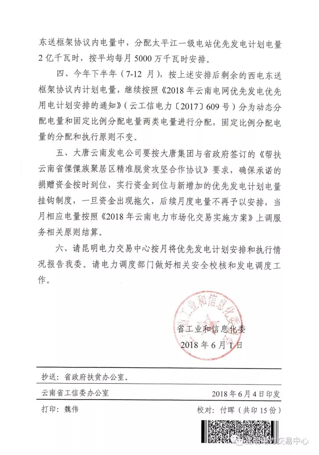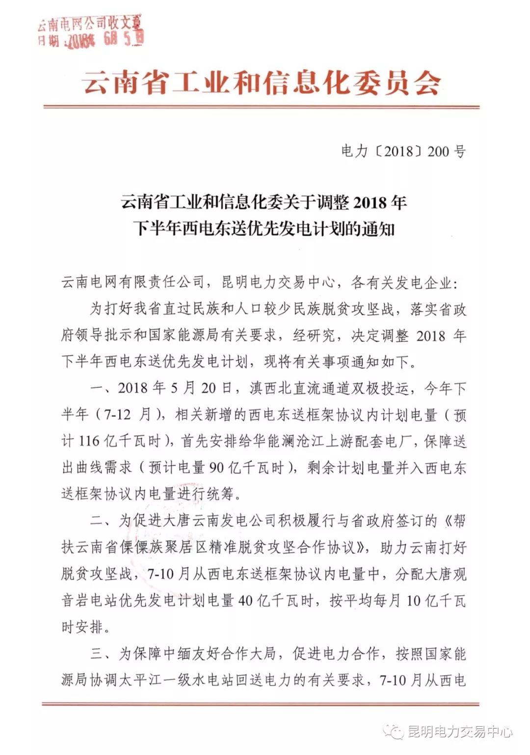 云南省工業(yè)和信息化委關(guān)于調(diào)整2018年下半年西電東送優(yōu)先發(fā)電計劃的通知
