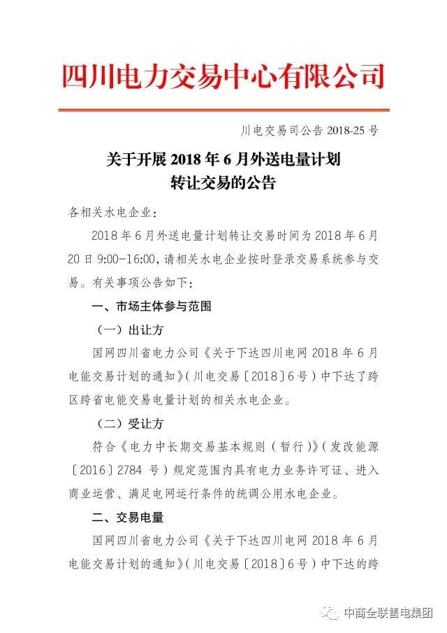 四川電力交易中心有限公司發(fā)布了《關(guān)于開展2018年6月外送電量計劃轉(zhuǎn)讓交易的公告》