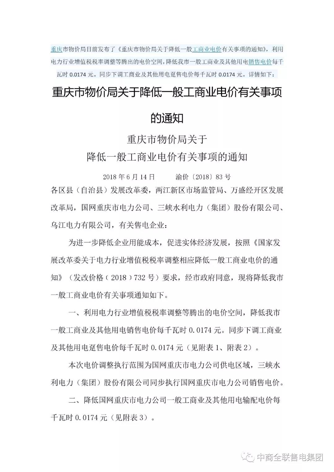 重慶市物價(jià)局發(fā)布了《關(guān)于降低一般工商業(yè)電價(jià)有關(guān)事項(xiàng)的通知》