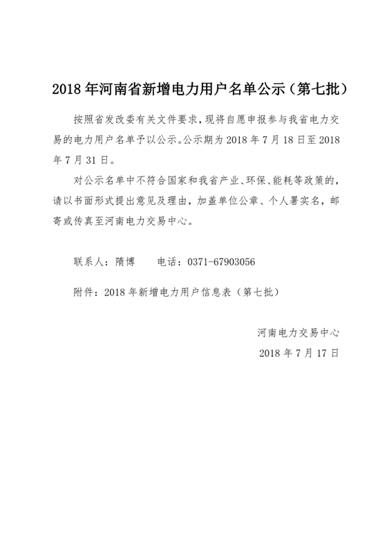 河南電力交易中心日前發(fā)布了《2018年河南省新增電力用戶名單公示(第七批)》,按照省發(fā)改委有關文件要求,現(xiàn)將自愿申報參與我省電力交易的128