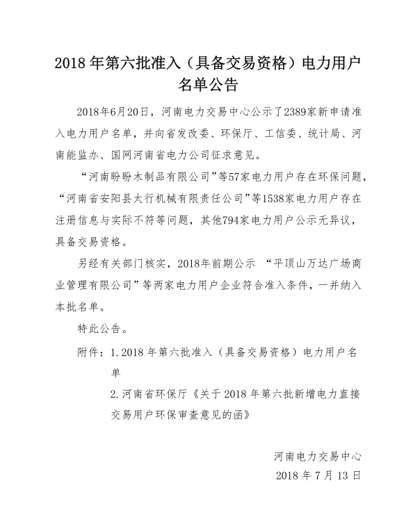 河南電力交易中心日前發(fā)布了《2018年第六批準(zhǔn)入(具備交易資格)電力用戶名單公告》,6月20日公示的第六批2389家電力用戶中只有794家獲得準(zhǔn)入,另外經(jīng)過核實2018年前期公示的2家電力用戶符合準(zhǔn)入標(biāo)準(zhǔn),一并納入本批名單。