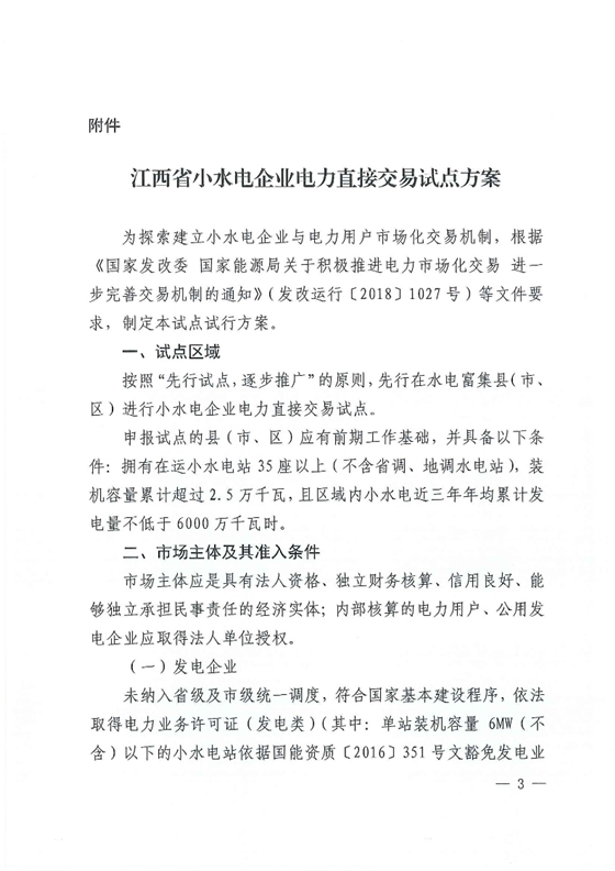 江西省能源局日前發(fā)布了《江西省能源局關(guān)于印發(fā)江西省小水電企業(yè)電力直接交易試點(diǎn)方案的通知》,試點(diǎn)區(qū)域:按照“先行試點(diǎn),逐步推廣”的原則,先行在水電富集縣(市區(qū))進(jìn)行小水電企業(yè)電力直接交易試點(diǎn)。