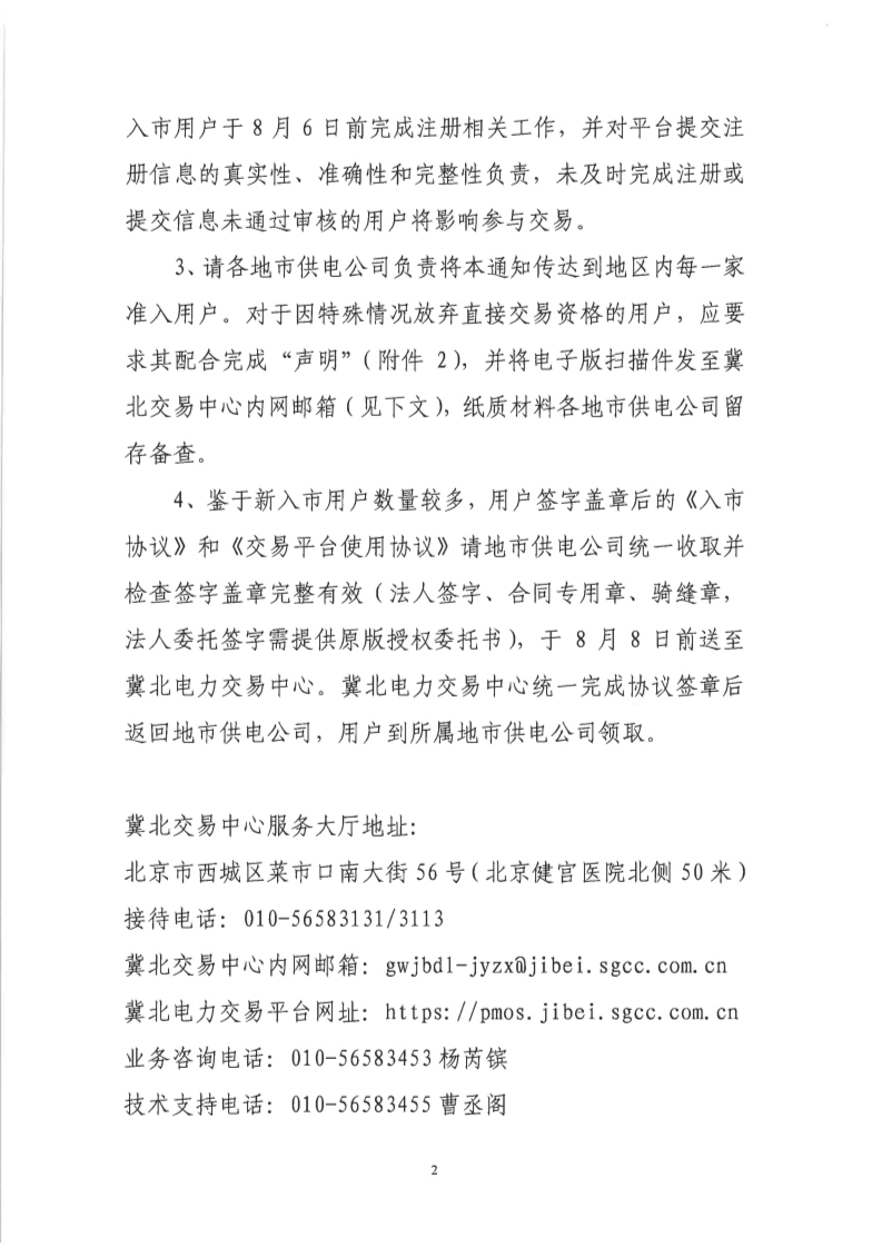 3、對于因特殊情況放棄直接交易資格的用戶,應(yīng)要求其配合完成“聲明”(附件2),并將電子版掃描件發(fā)至冀北交易中心內(nèi)網(wǎng)郵箱(見下文),紙質(zhì)材料各地市供電公司留存?zhèn)洳椤?/p>