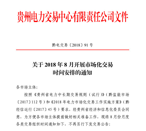 貴州電力交易中心日前發(fā)布了《關(guān)于2018年8月開展市場化交易時間安排的通知》,對8月份的市場化交易時間安排予以公示。對詳情如下:
