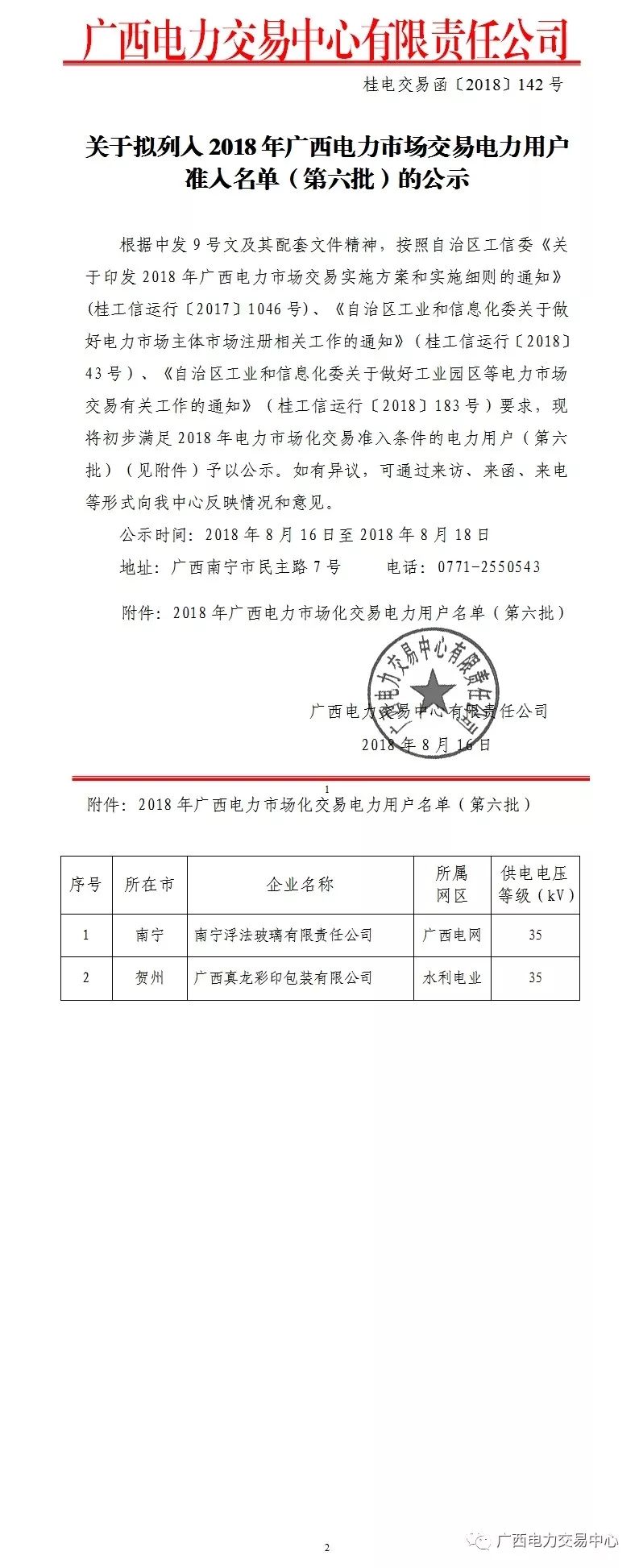 廣西電力交易中心日前發(fā)布了《關(guān)于擬列入2018年廣西電力市場(chǎng)交易電力用戶準(zhǔn)入名單(第六批)的公示》,將廣西南寧 南寧浮法玻璃有限責(zé)任公司 廣西電網(wǎng) 35kV;廣西賀州 廣西真龍彩印包裝有限公司 水利電業(yè) 35kV電力用戶名單予以公示。公示時(shí)間:2018年8月16日至2018年8月18日。詳情如下: