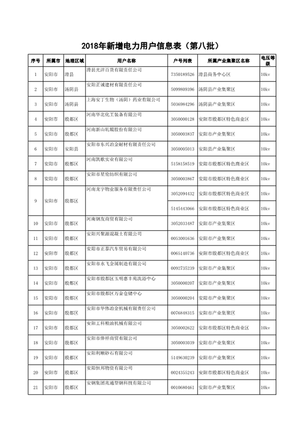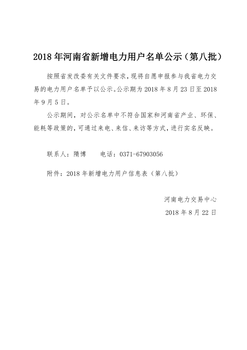河南電力交易中心日前發(fā)布了《2018年河南省新增電力用戶名單公示(第八批)》,按照省發(fā)改委有關(guān)文件要求,現(xiàn)將自愿申報(bào)參與我省電力交易的1472家電力用戶名單予以公示。公示期為2018年8月23日至2018年年9月5日。詳情如下: