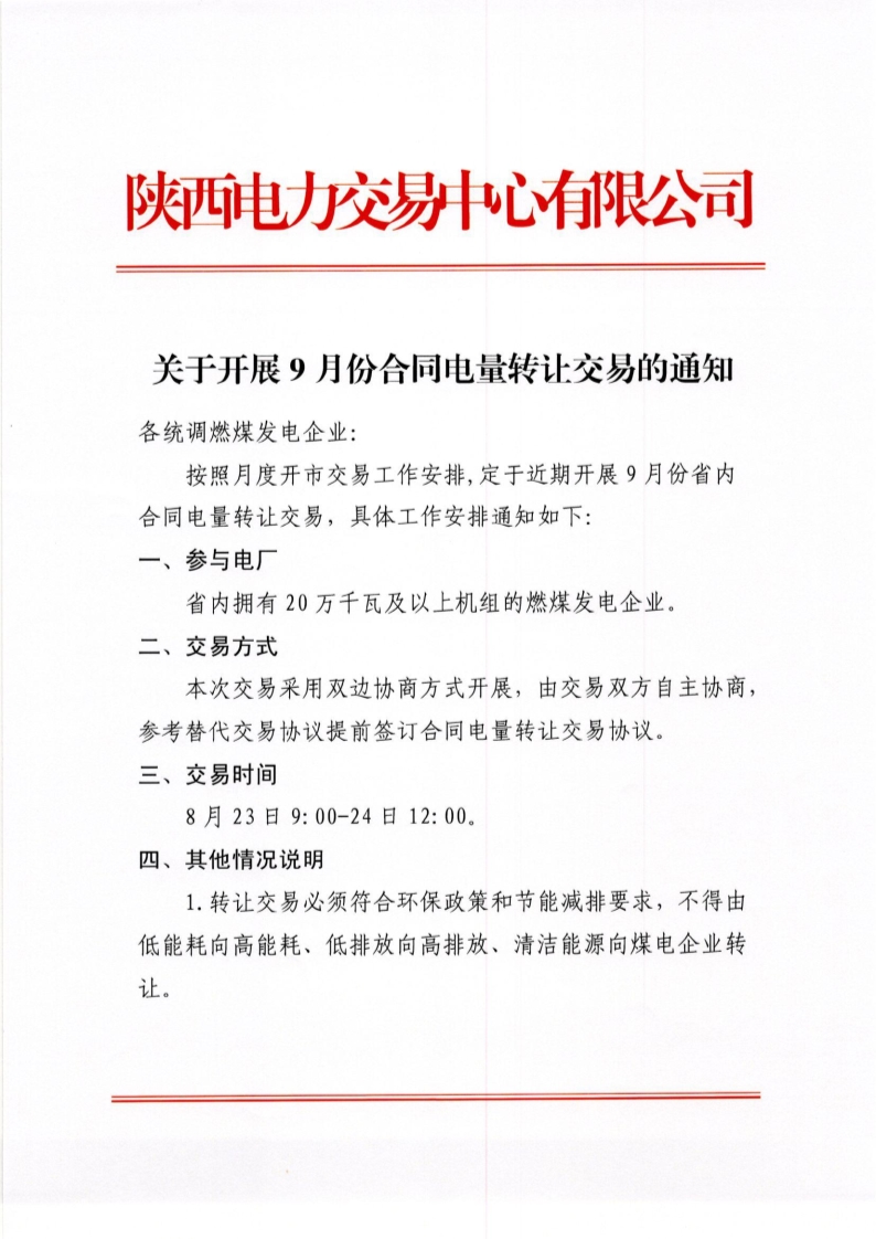 陜西電力交易中心日前發(fā)布了《關(guān)于開(kāi)展9月份合同電量轉(zhuǎn)讓交易的通知》,參與電廠擁有20萬(wàn)千瓦及以上機(jī)組的燃煤發(fā)電企業(yè)。交易方式:雙邊協(xié)商交易。交易時(shí)間;8月23日9:00-24日12:00