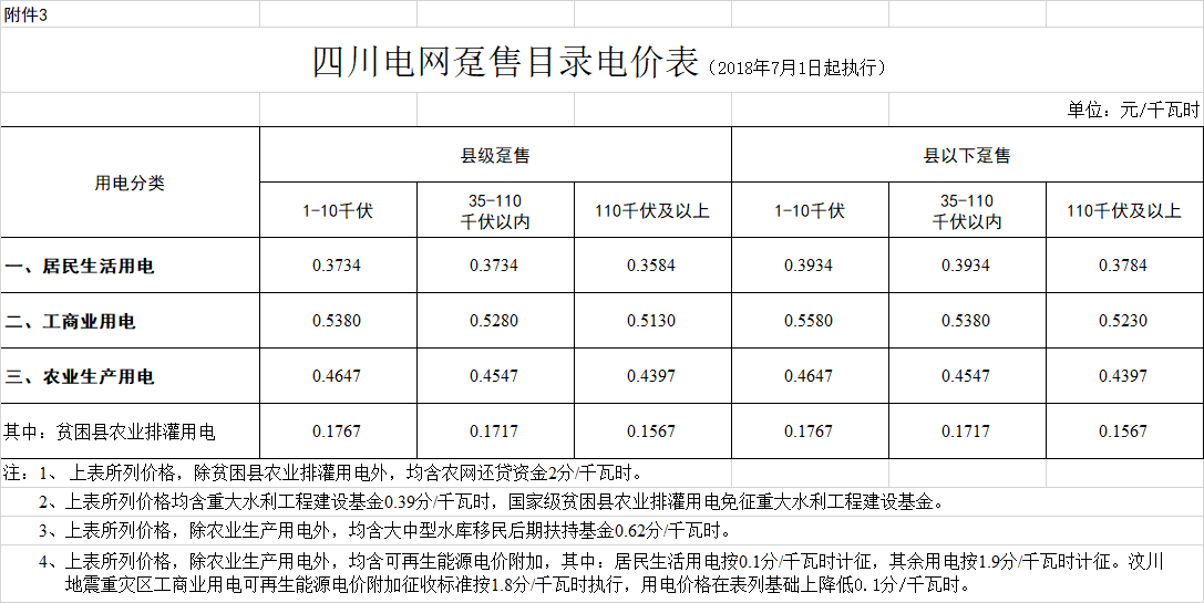附件:1.四川電網(wǎng)輸配電價(jià)表(2018年7月1日起執(zhí)行) 2.四川電網(wǎng)銷售電價(jià)表(2018年7月1日起執(zhí)行) 3.四川電網(wǎng)躉售電價(jià)表(2018年7月1日起執(zhí)行)