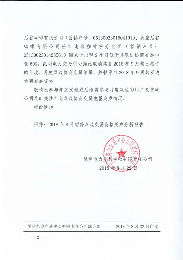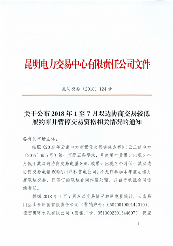 根據(jù)208年1至7月雙邊交易情況和用電量統(tǒng)計(jì),云南易門叢山食用菌有限責(zé)任公司(營銷戶號(hào):0504001900144010)、德宏奧環(huán)水泥有限公司(營銷戶號(hào):0513002301344607)、后谷咖啡有限公司(營銷戶號(hào):051300230504101)、德宏后谷咖啡有限公司芒市速溶咖啡粉分公司(營銷戶號(hào):051300231423561)因累計(jì)出現(xiàn)2個(gè)月低于其雙邊協(xié)商交易電量60%。昆明電力交易中心據(jù)此取消其自2018年9月起已簽訂的年度、月度雙邊協(xié)商交易結(jié)果,并暫停自218年9月起雙邊協(xié)商交易資格。詳情如下: