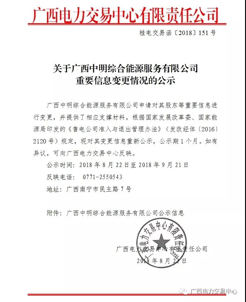 關(guān)于廣西中明綜合能源服務(wù)有限公司重要信息變更情況的公示
