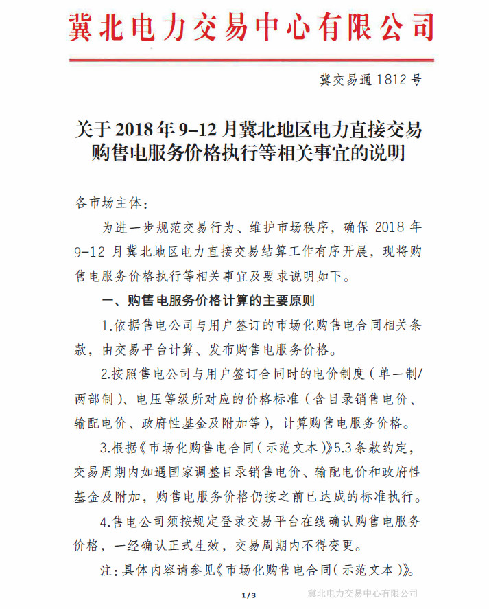 冀北地區(qū)9-12月電力直接交易:依據(jù)購(gòu)售電合同由交易平臺(tái)計(jì)算、發(fā)布購(gòu)售電服務(wù)價(jià)格