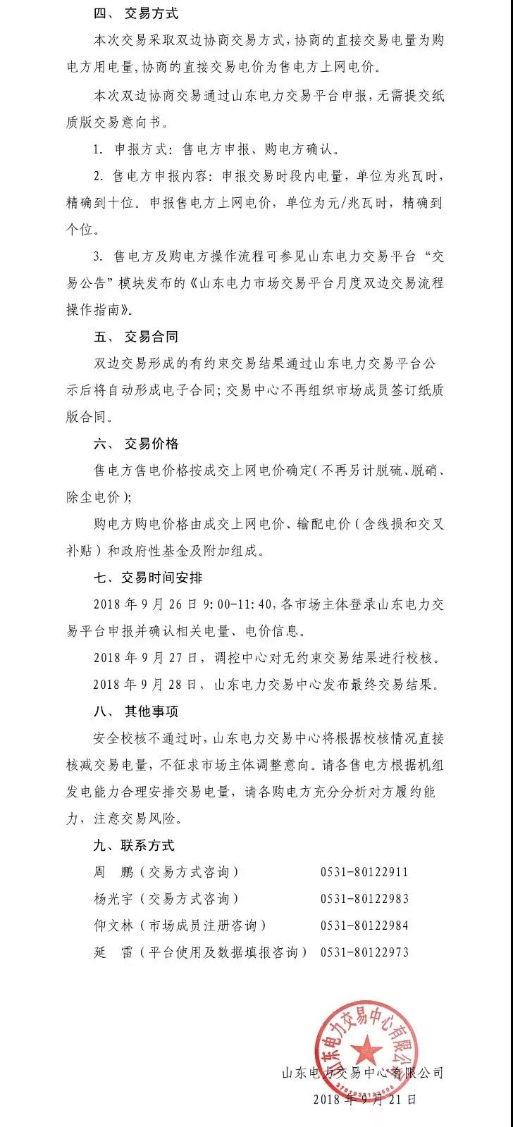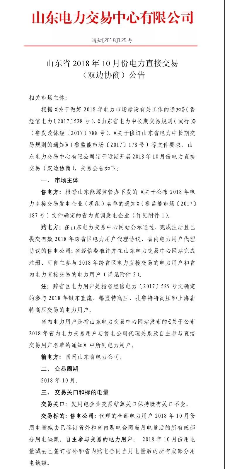 山東省2018年10月份電力直接交易 (雙邊協(xié)商)公告