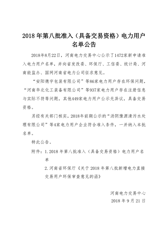 河南電力交易中心日前發(fā)布了《2018年第八批準入(具備交易資格)電力用戶名單公告》,8月22日,河南電力交易中心公示了1472家新申請準入電力用戶名單, “安陽德宇包裝有限公司”等86家電力用戶存在環(huán)保問題
