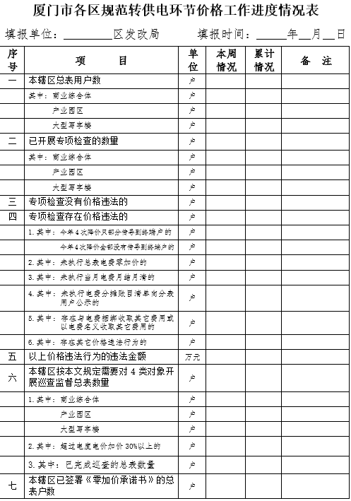 2.一周一報(bào)報(bào)告工作進(jìn)展情況。省物價(jià)局要求各地每周一次報(bào)告清理規(guī)范轉(zhuǎn)供電價(jià)格政策貫徹落實(shí)情況。從本周開(kāi)始至工信部組織的評(píng)查結(jié)束期間,請(qǐng)各區(qū)發(fā)改局和國(guó)網(wǎng)廈門供電公司在每周五下班前通過(guò)郵件(郵箱:fg_chenws@xm.gov.cn)向我委報(bào)送各自一周內(nèi)開(kāi)展工作的情況。各區(qū)發(fā)改局按附表1、2填報(bào);國(guó)網(wǎng)廈門供電公司重點(diǎn)報(bào)送接收非直抄改直抄的進(jìn)度等情況。