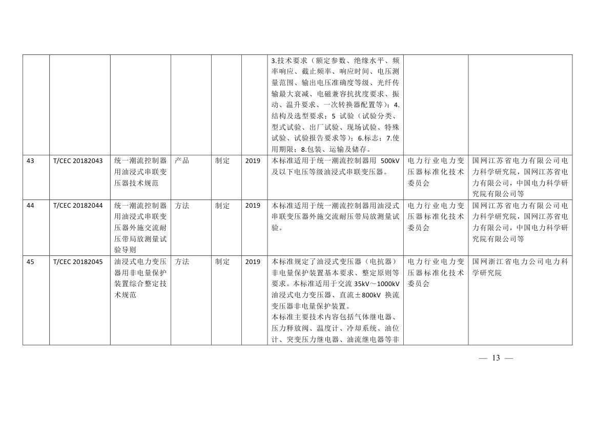 涉及輸變電工程質(zhì)量評(píng)價(jià)標(biāo)準(zhǔn)、特高壓及跨區(qū)電網(wǎng)智能運(yùn)檢管控系統(tǒng)功能規(guī)范、開關(guān)設(shè)備分合閘線圈電流波形帶電檢測(cè)儀器技術(shù)規(guī)范、高壓電纜在線監(jiān)測(cè)裝置運(yùn)行維護(hù)導(dǎo)則、柔性直流輸電工程換流閥子模塊中控板通用技術(shù)規(guī)范、配網(wǎng)帶電作業(yè)機(jī) 器人通用技術(shù)條件、分布式電源接入直流電網(wǎng)