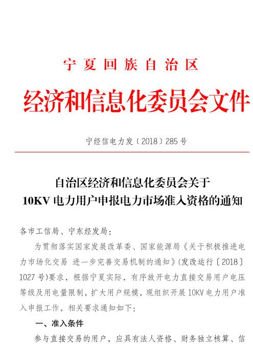 寧夏自治區(qū)經(jīng)信委日前發(fā)布了《自治區(qū)經(jīng)濟(jì)和信息化委員會(huì)關(guān)于10KV電力用戶(hù)申報(bào)電力市場(chǎng)準(zhǔn)入資格的通知》,根據(jù)寧夏實(shí)際,有序放開(kāi)電力直接交易用戶(hù)電壓等級(jí)及用電量限制,擴(kuò)大用戶(hù)規(guī)模,現(xiàn)組織開(kāi)展10KV電力用戶(hù)準(zhǔn)入申報(bào)工作,準(zhǔn)入條件有: