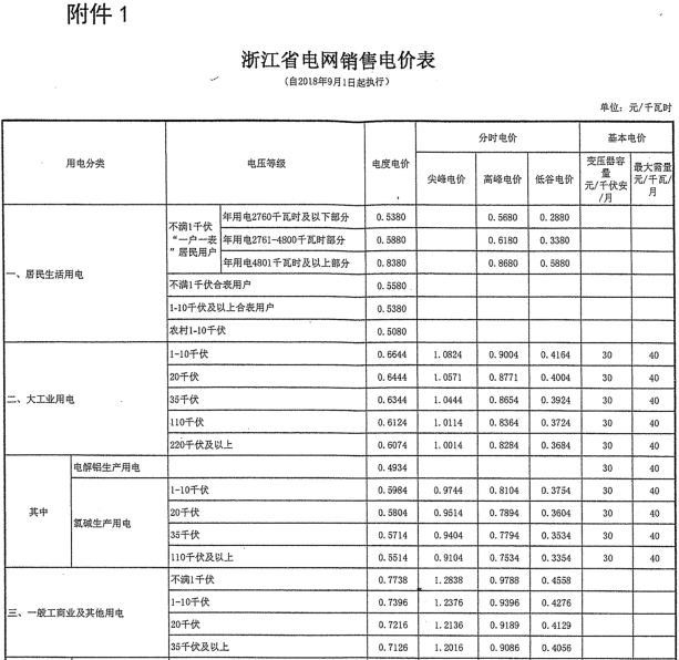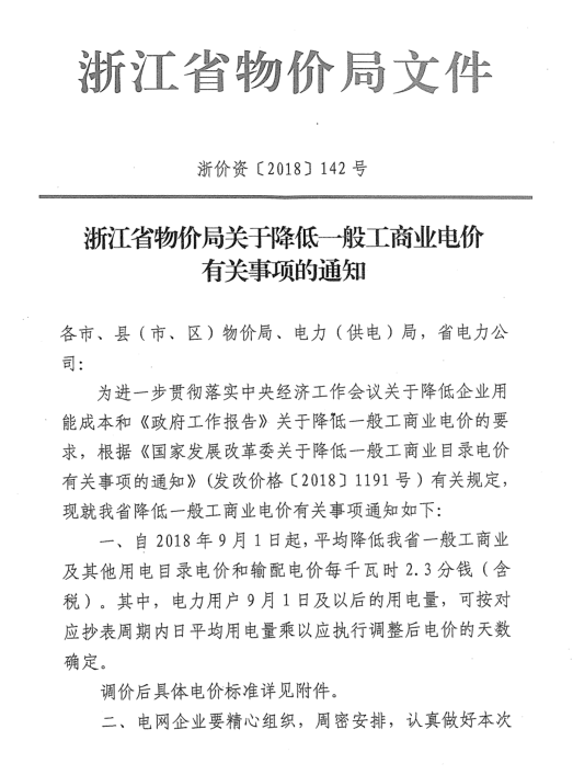 浙江省物價局日前發(fā)布了《關于降低一般工商業(yè)電價有關事項的通知》,通知中稱,自2018年9月1日起,平均降低浙江省一般工商業(yè)及其他用電目錄電價和輸配電價每千瓦時2.3分錢(含稅)。其中,電力用戶9月1日及以后的用電量,可按對應抄表周期內(nèi)日平均用電量乘以應執(zhí)行調整后電價的天數(shù)確定。