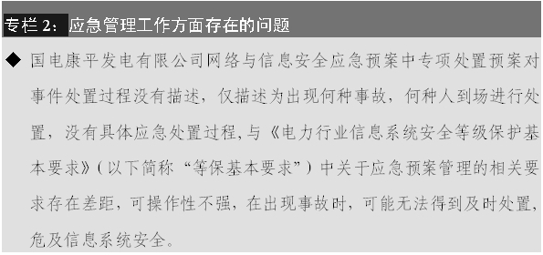 (3)部分企業(yè)電力二次系統(tǒng)安全防護(hù)應(yīng)急預(yù)案存在事故預(yù)想不全面、內(nèi)容不完整、相關(guān)要求缺乏可操作性等問題,缺少演練、培訓(xùn)和