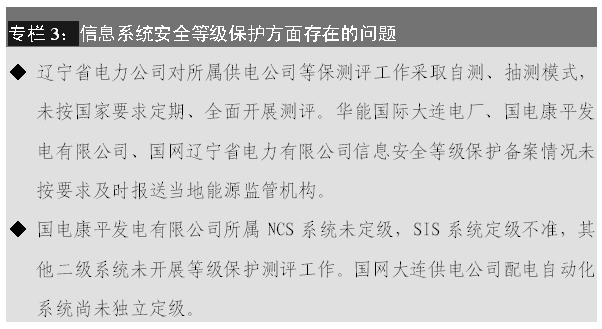 3. 部分電力企業(yè)對信息安全等級保護(hù)工作重視不夠,定級、備案、測評、整改等環(huán)節(jié)的各項(xiàng)要求落實(shí)不嚴(yán),主要體現(xiàn)在: