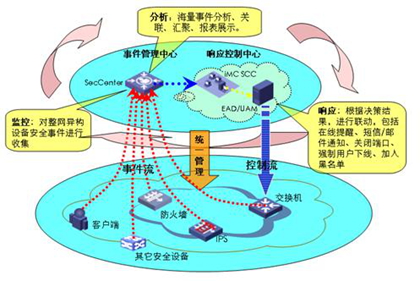 H3C安全管理中心解決方案主要組成設(shè)備為事件管理中心(SecCenter)和響應(yīng)管理控制中心(iMC SCC),事件管理中心主要完成對(duì)全網(wǎng)安全事件的采集、分析、關(guān)聯(lián)、匯聚、報(bào)表報(bào)告展示,響應(yīng)控制中心實(shí)現(xiàn)了安全事件與網(wǎng)管系統(tǒng)(iMC 平臺(tái))、用戶管理系統(tǒng)(EAD/UAM)的結(jié)合,對(duì)需要響應(yīng)的重要事件可靈活進(jìn)行短信通知、Email通知、交換機(jī)端口關(guān)閉、用戶下線、加入黑名單、在線提醒等響應(yīng)操作。