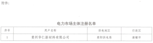 貴州省經(jīng)信委日前發(fā)布了《關(guān)于對(duì)列入政府準(zhǔn)入目錄的電力市場(chǎng)主體進(jìn)行公示的通知》,通知中稱,貴州華仁新材料有限公司符合年度電力市場(chǎng)化交易準(zhǔn)入條件,同意列入貴州電力市場(chǎng)主體準(zhǔn)入目錄。詳情如下: