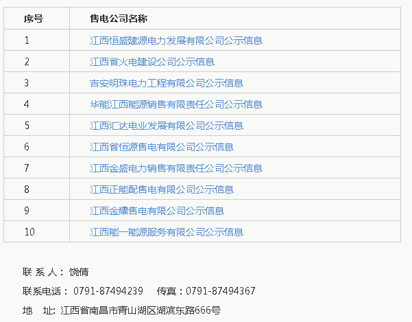 公示期間,任何單位和個人如有異議,可通過來電、來信、來訪等方式向江西電力交易中心有限公司實名反映。本次公示售電公司目錄如下: