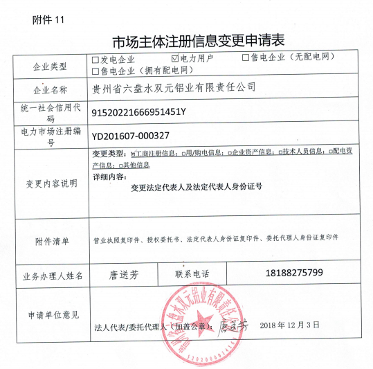 附件1:《市場主體注冊(cè)信息變更申請(qǐng)表(貴州省六盤水雙元鋁業(yè)有限責(zé)任公司)》