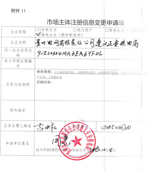 附件5:《市場主體注冊(cè)信息變更申請(qǐng)表(貴州電網(wǎng)有限責(zé)任公司遵義正安供電局)》