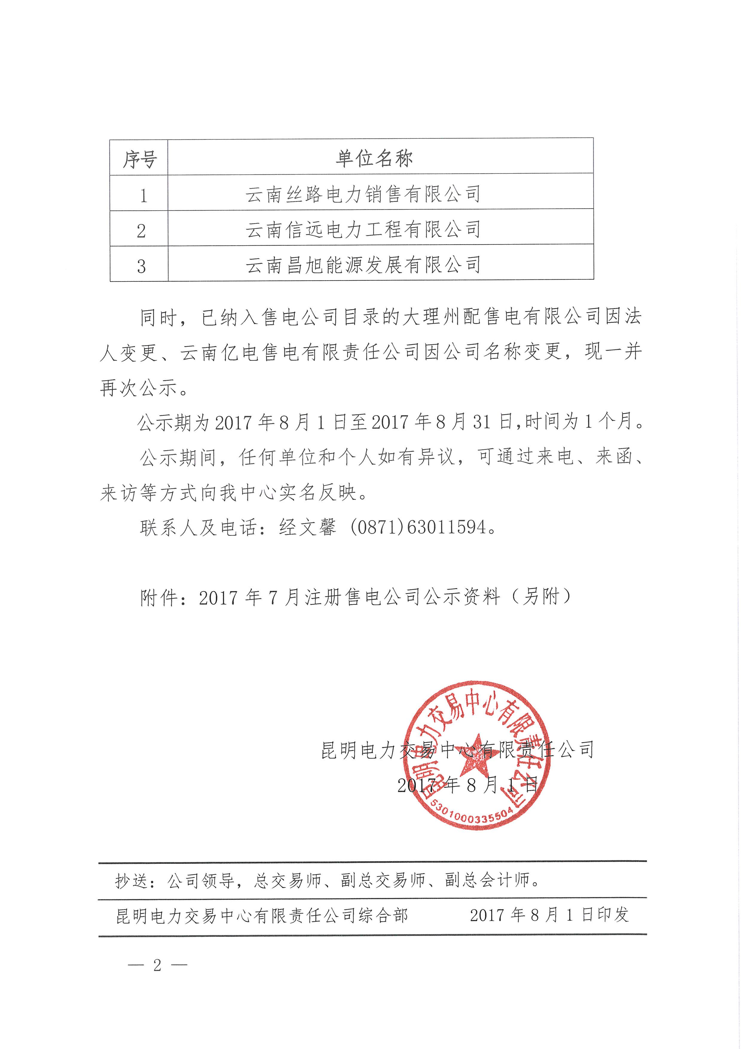 昆明電力交易中心關于公示2017年7月注冊售電公司的公告
