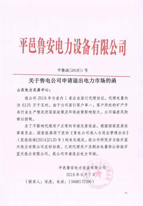 山東電力交易中心日前發(fā)布了《關(guān)于對平邑魯安電力設(shè)備有限公司自愿退出電力市場進行公示的公告》,繼山東世紀(jì)航凱售電有限公司自愿退出電力